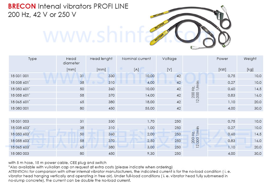 BRECON internal vibrators for connection to frequency inverters are available in 31, 38, 50, 58, 65 and 80mm diameter for 42/200Hz or 250V/200Hz input.